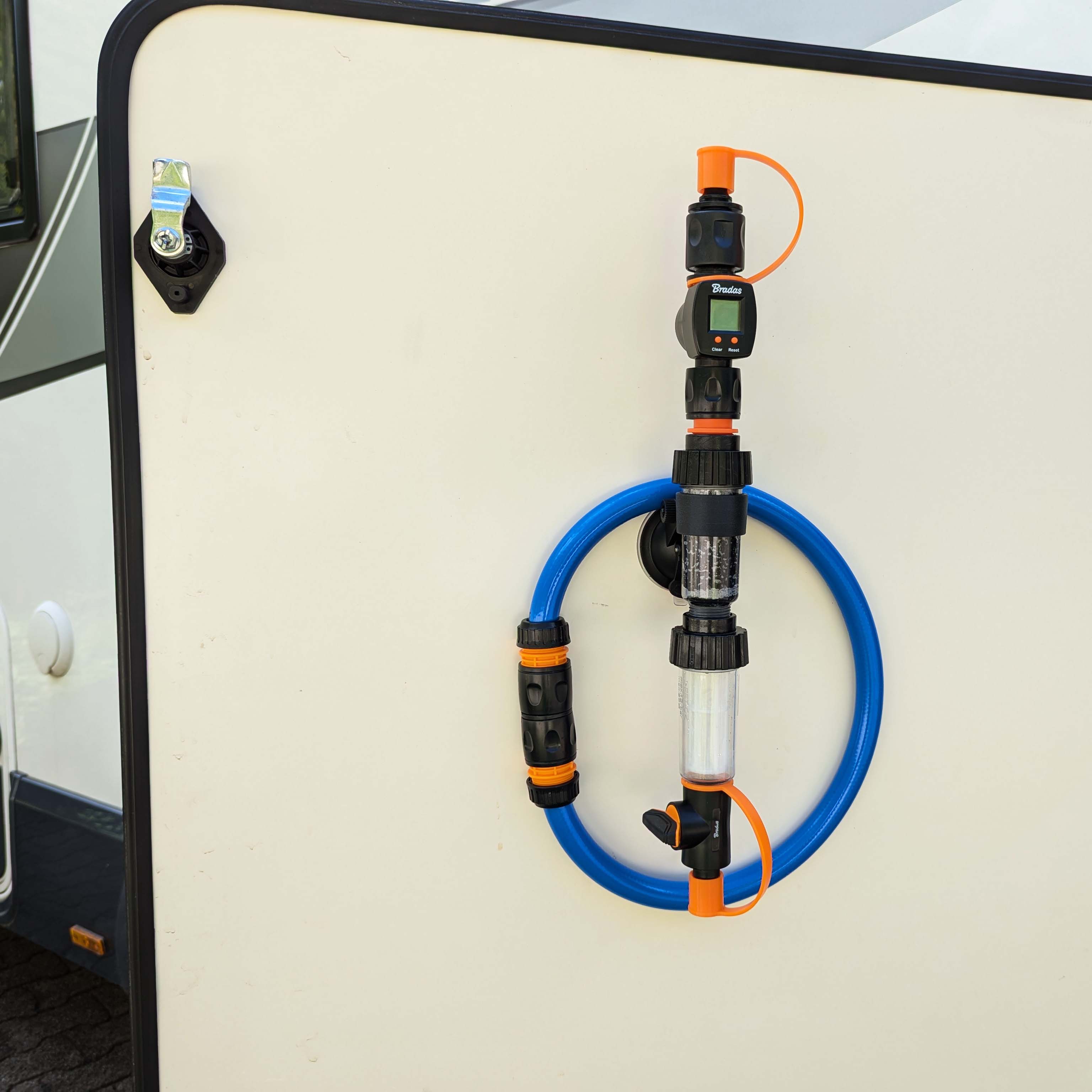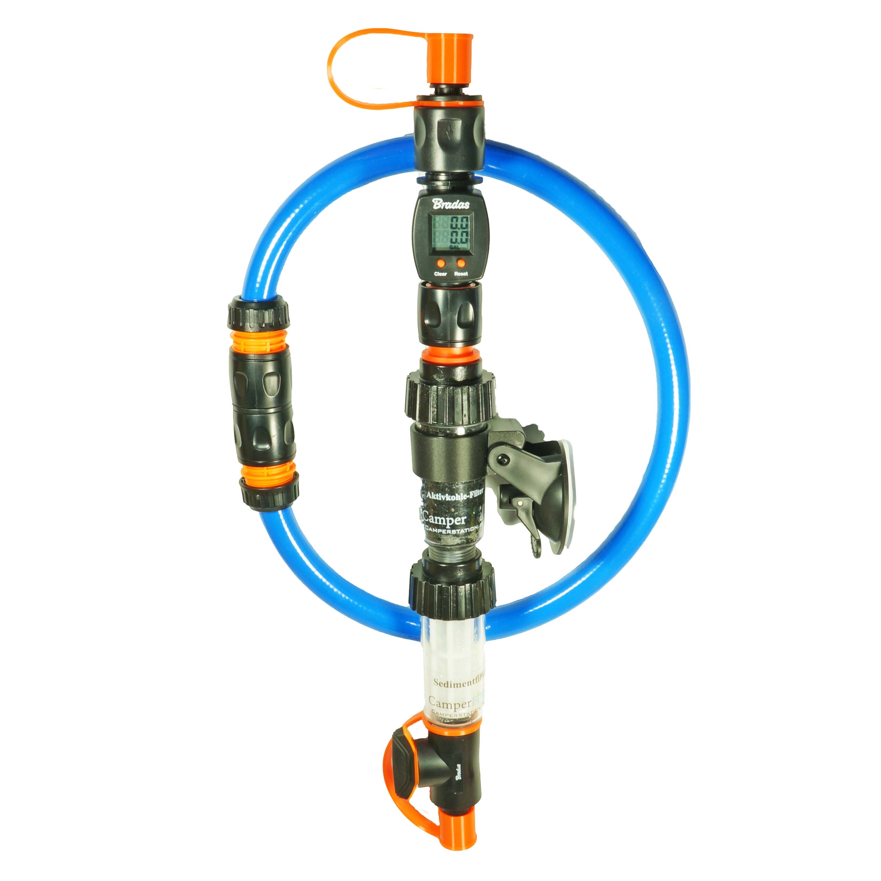 Filter-Set mit Sedimentfilter und Aktivkohlefilter plus digitaler Wasserzähler plus Trinkwasserschlauch und Komforthalter.