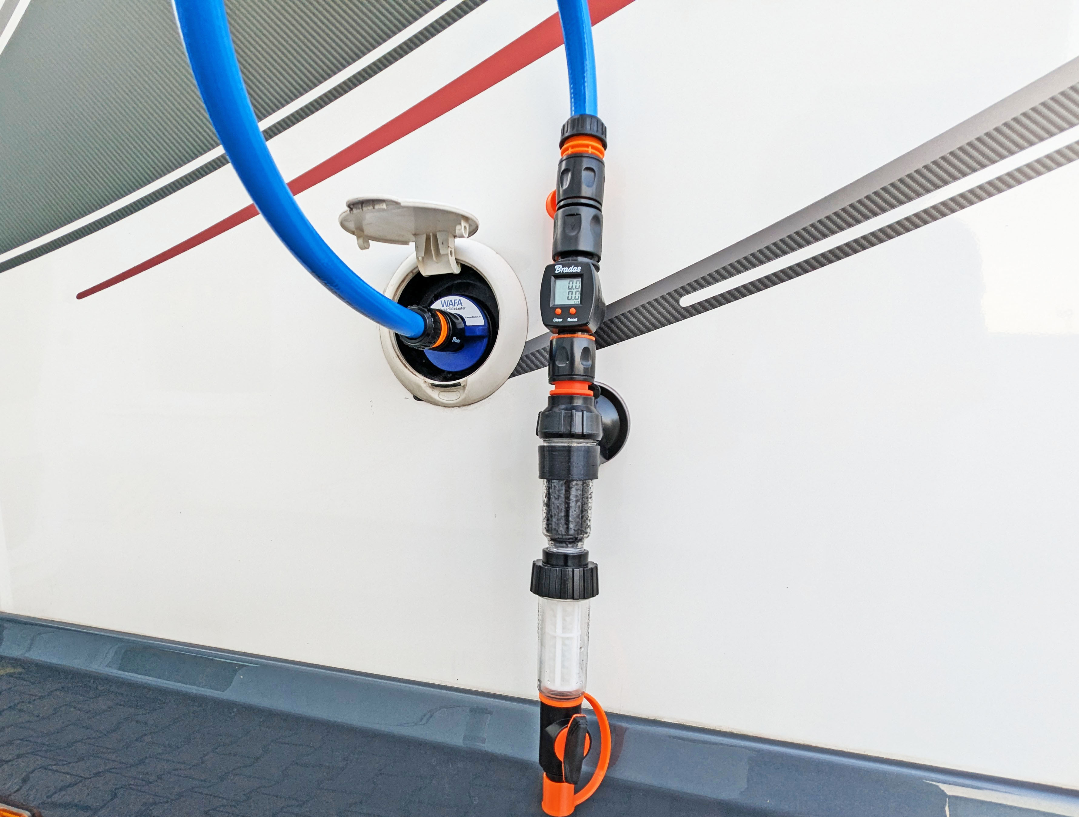 Beim Einsatz des Filtersystems, besonders mit Aktivkohlefilter, kann die Durchflussmenge sinken. Grund ist die feine Struktur der Aktivkohle, die für gründliche Filterung sorgt, aber den Wasserdurchsatz reduziert. Auch der Eingangsdruck spielt eine Rolle – und ggf. den Zulaufschlauch (z. B. bei langen oder dünnen Leitungen) prüfen. Entnahmestellen auf Campingplätzen bieten nicht immer den optimalen Wasserdruck. Achten Sie auf korrekte Fließrichtung und senkrechten Einbau zur Vermeidung von Luftblasen. Bei längerer Nutzung kann die Aktivkohle gesättigt sein – ein Filterwechsel ist dann ratsam, auch wenn sich dies nicht direkt am Zustand des Wassers zeigt.