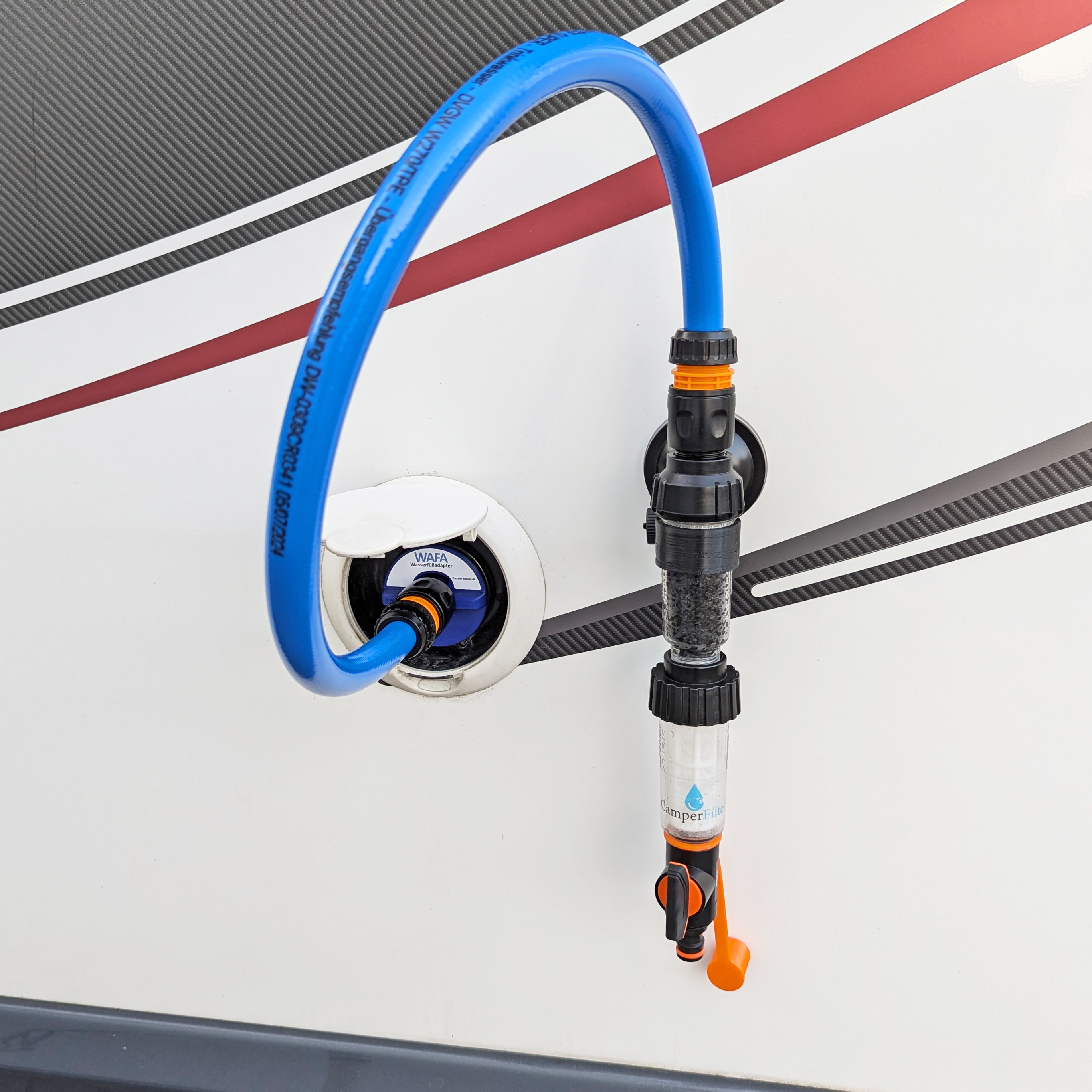 Zum bequemen befestigen des Filtersystems während dem Befüllvorgang an der Fahrzeugwand. Nach Gebrauch einfach das System ausgießen und an der Innenwand der Wohnmobilgarage aufhängen.
