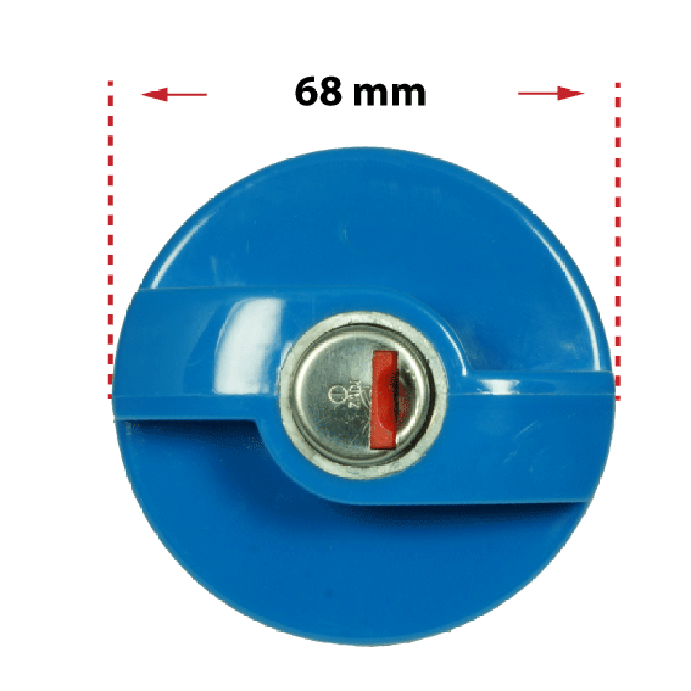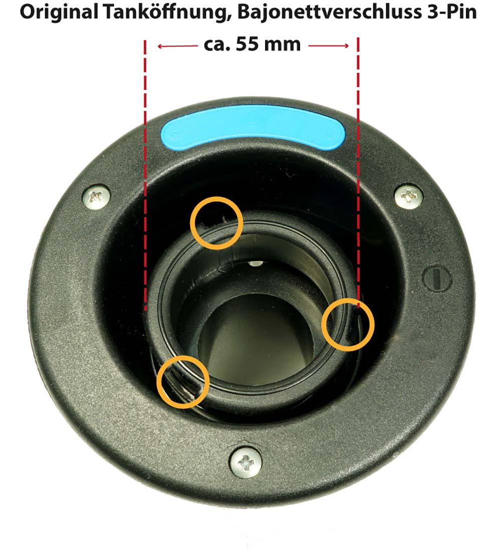 For convenient filling of fresh water tanks in motorhomes, using familiar quick coupling systems for 1/2 inch hoses (Gardena, etc.). Suitable for water tanks with and without overflow. Bayonet fitting with 3 spigots suitable for 68 mm lid diameter or tank filler openings with 55 mm diameter (see photos).